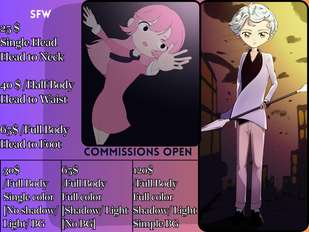 WHAT DO I DRAW AND DON'T DRAW?DRAWINGSFW.- Material for all ages (Action, fantasy, romance, supernatural, etc.)NSFW.- Adult material (May include pornography,