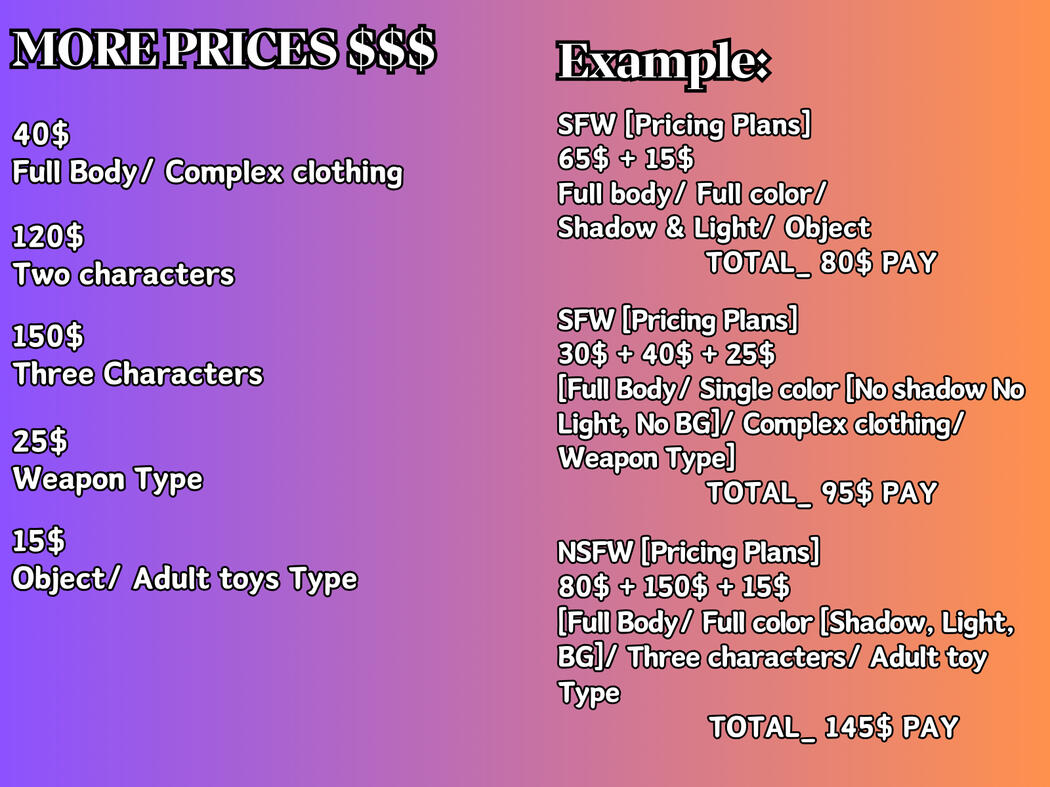 WHAT DO I DRAW AND DON'T DRAW?DRAWINGSFW.- Material for all ages (Action, fantasy, romance, supernatural, etc.)NSFW.- Adult material (May include pornography,